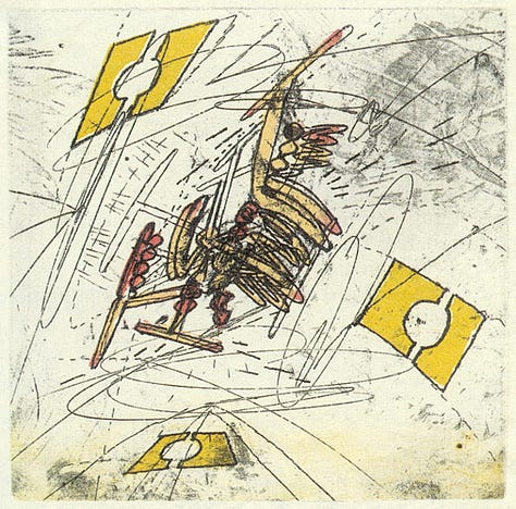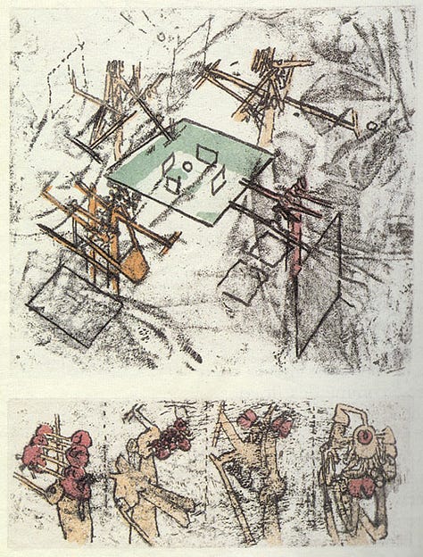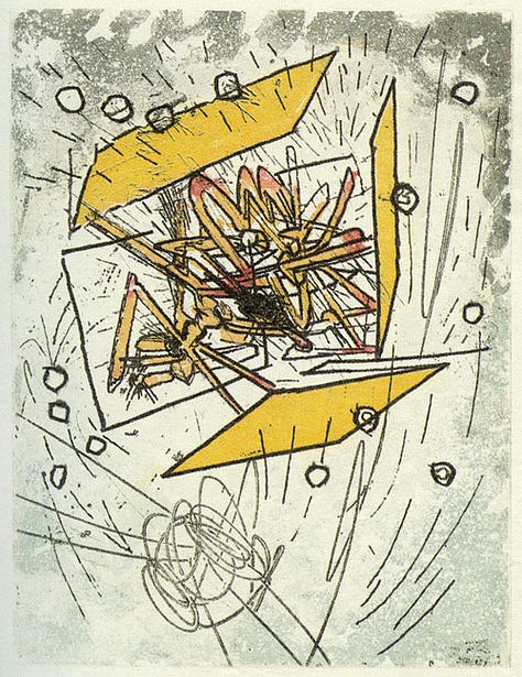 Roberto Matta’s etchings takes a view one step removed from the ‘recordings’ above. They appear as schematics that describe the organism in its capacity as a particle, under study, bombarded, energetic. Here the action doesn’t take place on the surface of the page, but within it, allowing us to appreciate the picture plane as a space of action where impulses are unleashed in order to be studied. Where for Michaux the page gives these forces form, Matta shows us the mechanisms built to corral them.