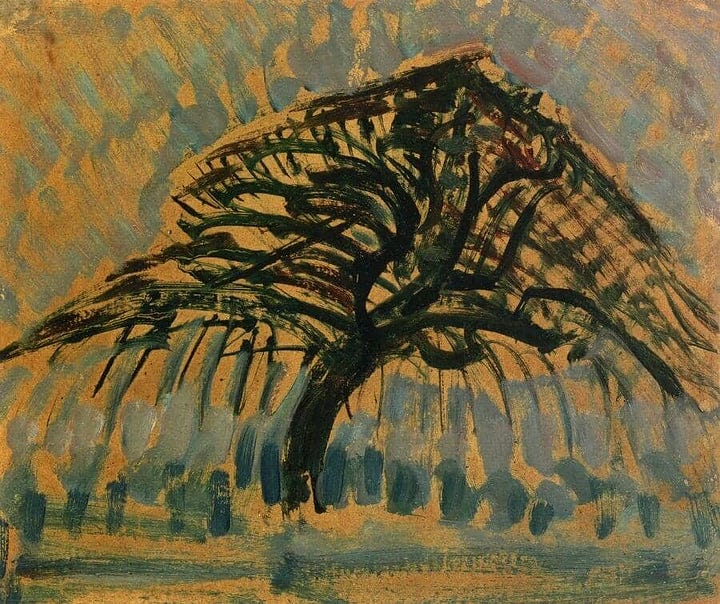 In contrast the to the “line” which suggests a classical physics model of cause and effect, the (force) field) is a space where figure and ground appear knit out of a tense mesh of marks. Mondrian’s early tree paintings seem a good example of this, with colour field painting as this principle taken to its abstract limits. Van Gogh, Edvard Munch, are other approachable examples of work where the ground is activated, brought to the fore. This is such a general point, but I feel it is a fun way to reimagine the impressionist and expressionist as a type of pansychism, where all things are endowed with the same energy.