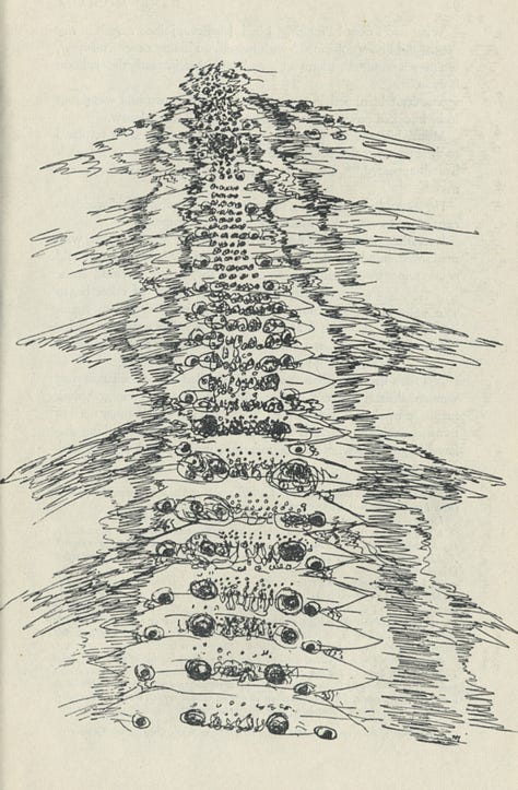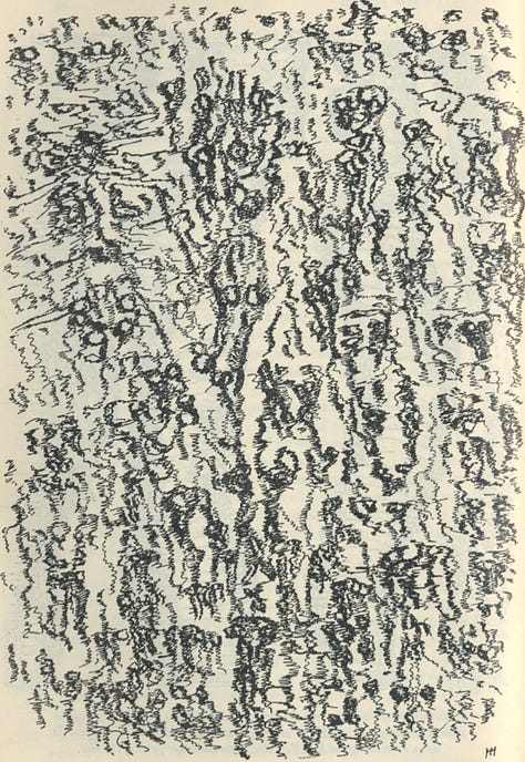 Henri Michaux’s mescaline drawings seem to best express how the line records mental activity. I experience his strokes as readouts of anxiety, restlessness, agitation—graphing the body in its dimension as a natural phenomenon. This is not coincidental, Michaux describes his awareness of consciousness (the vibratile carpet), or what happens below it, using a range of scientific imagery.