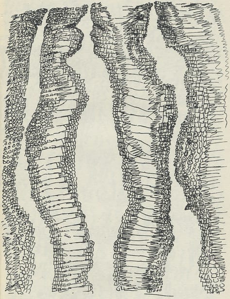 Moving away from abstraction, there is the obvious point that prior to photography scientific illustration filled in the gaps. Drawings of microorganisms, DNA, crystal structures, etc all purport to show us the structure of the world made visible while doubling as mesmerizing artifacts. I think there is an interesting contradiction in this mode, which is the simultaneous desire to be photoreal and but make ideal depictions. For example we have Santiago Ramón y Cajal’s drawings of brain cells as against the visualization of the DNA double helix. In the first case there’s not much more for me to say here other than to acknowledge the beauty of these renderings. For the second I am interested in this need to “average” the thing perceived, and how this forms an aesthetic of objectivity. Audubon is an example of this on the human scale. But the farther we move down in scale the more messy these representations become, eventually reduced to the level of schematic. Think Feynman diagrams. This gradient from the particular to the universal is fascinating, intractable.