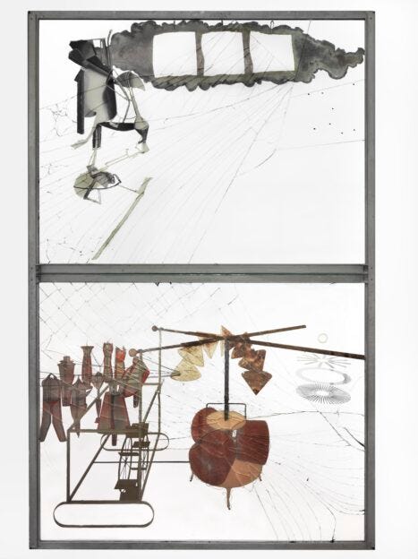 The placement of the Bachelors' nine "shots" (which never do reach the waiting Bride) was effected by dipping matches in wet paint and firing them from a toy cannon at the Glass. The forces of gravity, wind, and "personalized chance" were thus substituted for the workings of his own conscious hand, always in the spirit of hilarity that Duchamp once paraphrased as that "necessary and sufficient twinkling of the eye," and always with the same meticulous, painstaking attention to detail that a scientist might apply to a controlled nuclear experiment